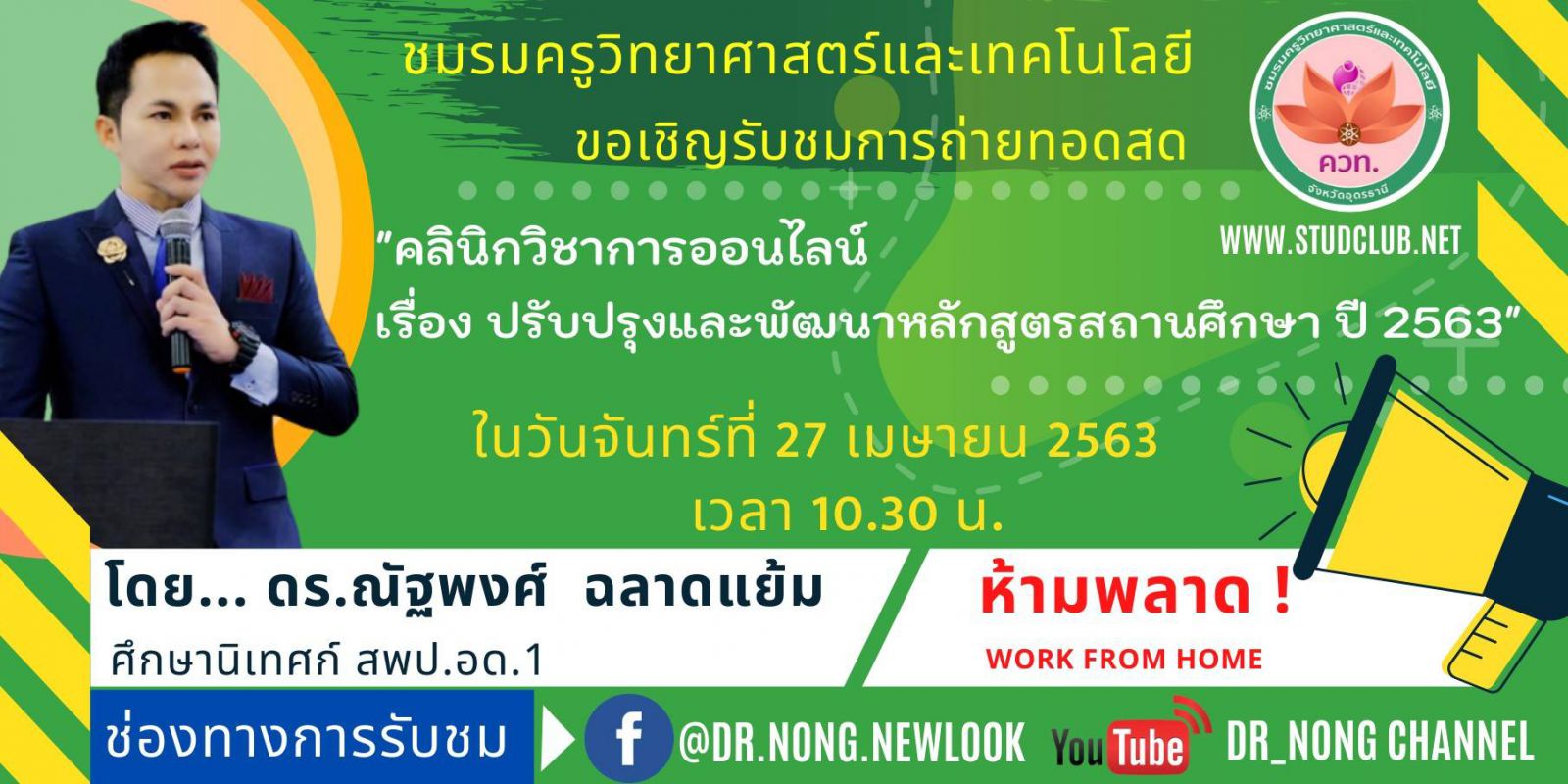 ชมรมครูวิทยาศาสตร์และเทคโนโลยีขอเชิญรับชมการถ่ายทอดสด คลีนิควิชาการออนไลน์ เรื่อง ปรับปรุงและพัฒนาหลักสูตรสถานศึกษาปี 2563 ในวันจันทร์ที่ 27 เมษายน 2563 เวลา 10.30